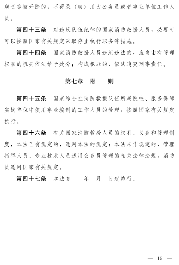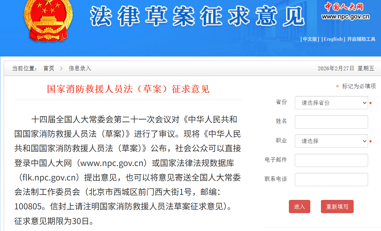 《中華人民共和國 消防救援人員法(草案)》已于2月27日公布,社會(huì)公眾可以直接登錄中國人大網(wǎng)或 法律法規(guī)數(shù)據(jù)庫提出意見,也可以將意見寄送全國人大常委會(huì)法制工作委員會(huì)(北京市西城區(qū)前門西大街1號(hào),郵編:100805。信封上請(qǐng)注明 消防救援人員法草案征求意見)。
