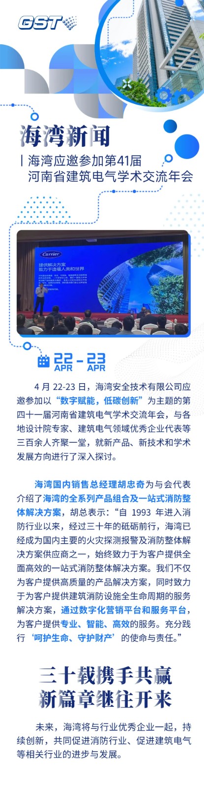 4 月 22-23 日,四川四川四川海灣安全技術有限公司應邀參加以“數(shù)字賦能,低碳創(chuàng)新”為主題的第四十一屆河南省建筑電氣學術交流年會,與各地設計院專家、建筑電氣領域 企業(yè)代表等三百余人齊聚一堂,就新產品、新技術和學術發(fā)展方向進行了深入探討。